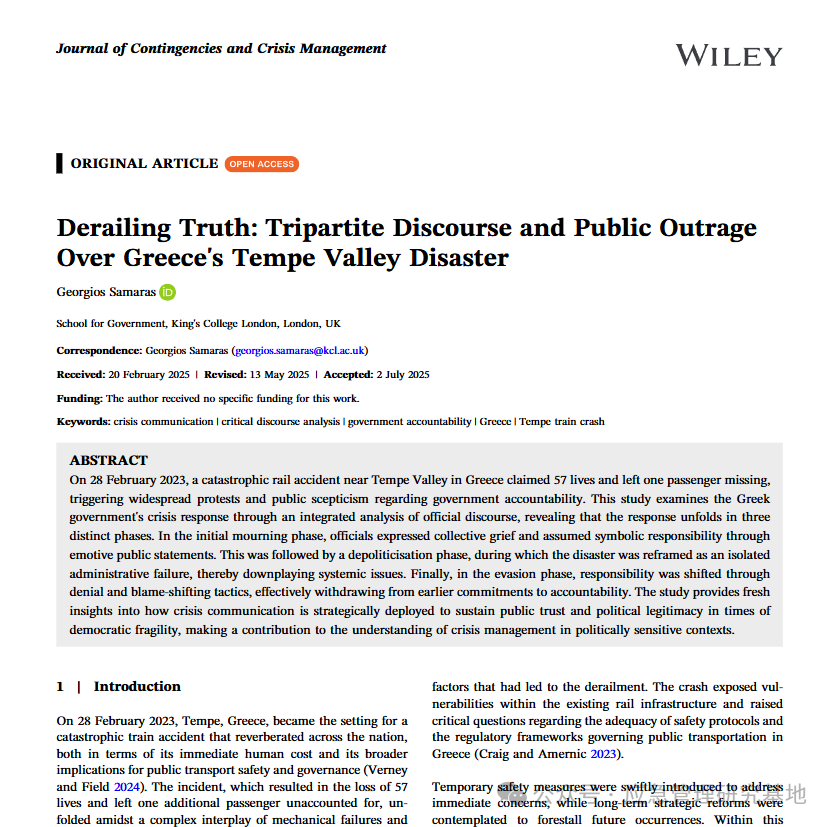 [概述] 来自伦敦国王学院Georgios Samaras关注2023年2月28日希腊坦佩发生的灾难性的火车事故中的三方话语与公众的愤怒。 2023年2月28日,希腊坦佩谷附近发生重大铁路事故,造成57人遇难、1名乘客失踪,引发大规模抗议活动并引发公众对政府问责制的质疑。本研究通过整合分析官方话语,揭示了希腊政府危机应对的三个阶段:初始哀悼阶段,官员们通过情感化公开声明集体表达悲痛并承担象征性责任;随后进入去政治化阶段,将事故重新定义为孤立的行政失误,淡化系统性问题;最终进入逃避阶段,通过否认和推诿责任的策略转移问责,实质上背弃了先前承诺。该研究为理解民主脆弱时期如何通过战略部署危机传播来维系公众信任与政治合法性提供了新视角,为把握政治敏感环境下的危机管理之道作出重要贡献。 编译|杨巧月