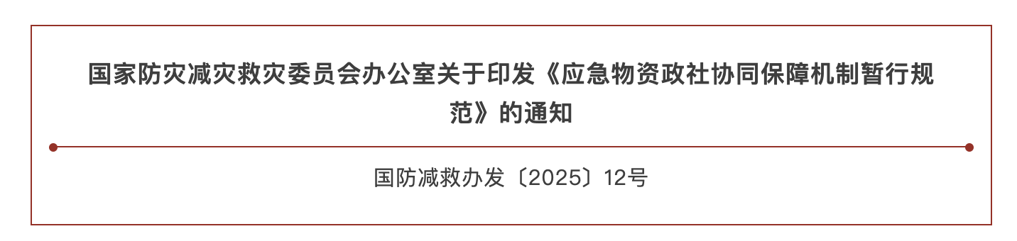 各省、自治区、直辖市防灾减灾救灾议事协调机构,新疆生产建设兵团防灾减灾救灾委员会,国家防灾减灾救灾委员会各成员单位: 现将《应急物资政社协同保障机制暂行规范》印发你们,请结合实际认真执行。 应急物资政社协同保障机制暂行规范 第一条 为进一步规范应急物资政社协同保障机制运行,提升应急物资配置效率,根据《国家突发事件总体应急预案》《中华人民共和国突发事件应对法》《中华人民共和国慈善法》《中华人民共和国公益事业捐赠法》《自然灾害救助条例》《国家自然灾害救助应急预案》等法律法规和预案,制定本规范。 第二条 应急物资政社协同保障机制(以下简称政社协同机制)是国家防灾减灾救灾委员会办公室(以下简称国家防减救灾办)、应急管理部牵头建立,基金会、行业协会、社会服务机构、志愿服务组织等社会组织作为成员参与,根据自然灾害等重特大突发事件物资保障需要,在政府支持调拨应急抢险救灾物资基础上,规范开展社会援助捐赠物资的协同保障机制。根据保障需要,国家防减救灾办、应急管理部协调工业和信息化部、交通运输部、商务部、国家粮食和物资储备局、中国红十字会总会以及涉灾的省级有关部门等给予指导支持。 第三条 政社协同机制建设管理具体由应急管理部救灾和物资保障司(以下简称救灾司)负责。救灾司会同政社协同机制成员建立政社协同机制服务平台(以下简称服务平台),具体承担协调各方资源,援助应急抢险救灾物资,并组织做好政社协同机制成员进入退出、信息共享、绩效评价、会议活动等工作。 第四条 服务平台负责建立健全联络员、信息共享和定期会商等工作制度,定期开展会商和信息通报,总结工作开展情况,研究确定重点工作。发生自然灾害,开展物资援助期间,及时汇总编发工作动态。政社协同机制各成员确定A、B角联络员,负责工作协调和应急联络。 第五条 申请加入政社协同机制的社会组织应当符合以下条件: (一)依法在民政部门登记; (二)自愿加入并遵守救灾工作统一部署; (三)评估等级为4A级及以上; (四)没有活动异常或严重违法失信等情况; (五)具有较强的社会资源动员整合能力; (六)具有较为丰富的参与应对自然灾害等应急慈善工作经验。 第六条 申请加入政社协同机制的社会组织,应当提供相关证明材料,经服务平台确认后,签署合作协议。 第七条 重特大自然灾害等突发事件发生后,政社协同机制按照以下程序开展工作: (一)服务平台根据工作部署,对接灾区救灾指挥部了解灾情和应急物资缺口,向政社协同机制成员通报。 (二)政社协同机制成员根据灾区需求,盘点调度可动用资源,确定援助物资品种、数量、地点、起运时间、预计运抵时间、运输线路和车辆信息等,并及时向服务平台反馈。 (三)服务平台向政社协同机制成员发出援助物资函,明确援助物资品种、数量、接收地点、联系人及联系方式等。 (四)政社协同机制成员按照指令筹集并运输援助物资,对物资质量严格把关,确保按期保质保量运抵灾区。 (五)政社协同机制援助物资及运输车辆应按照《应急救灾物资标识推广使用指南》要求,张贴或悬挂应急救灾物资统一标识,运输任务完成后及时撤收。 (六)服务平台协助和指导灾区制定物资分配方案,相关援助物资服从灾区统一调配,由灾区负责提供运输车辆快速通行便利,准备物资临时存放场地,协调装卸设备及物资发放人员,建立物资接收和发放台账等。 (七)政社协同机制成员及时汇总并向服务平台反馈物资运输等情况,服务平台及时将物资接收、分配和发放等情况通报政社协同机制成员。 (八)政社协同机制成员充分发挥新闻媒体在应急状态下收集反馈社会求助信息作用,为政府、社会和受灾群众快速便捷沟通提供渠道。 第八条 国家防减救灾办、应急管理部视情派出专项工作组,现场督促协调物资统筹、运输、临时存储、分配发放和信息反馈等全链条闭环管理工作。 第九条 国家防减救灾办、应急管理部视情协调交通运输部按照抢险救灾任务车辆免费通行服务保障规程等规定,为符合条件的政社协同机制援助物资运输车辆提供收费公路免费通行等便利;针对政府实物储备少,但灾区紧缺急需的生活必需品等物资,协调工业和信息化部、商务部等提供生产、流通、储备企业等信息;协调国家粮食和物资储备局为政社协同机制援助物资安排临时存储场地等。 第十条 中国红十字会总会根据需要调拨净水设备、厕所等卫生设备、家庭应急包等救灾物资并做好维护管理,协调和指导红十字会系统相关基金会开展政社协同物资保障。 第十一条 国家防减救灾办、应急管理部根据政社协同机制援助情况,统一发布新闻信息。政社协同机制成员发布涉及政社协同机制的新闻信息,需报服务平台确定。 第十二条国家防减救灾办、应急管理部根据政社协同机制援助情况,对在重特大自然灾害援助保障过程中快速响应、援助物资有力、反馈及时的组织或个人,向相关部门推荐评优、评先等;对多次未履行协同义务、发布虚假信息、物资使用管理不规范、造成负面舆情等不良影响的,视情取消其成员资格,并向相关部门通报。 第十三条 鼓励各地结合本区域自然灾害风险特点和社会资源基础,探索建立本区域政社协同机制。 第十四条 本规范由国家防减救灾办、应急