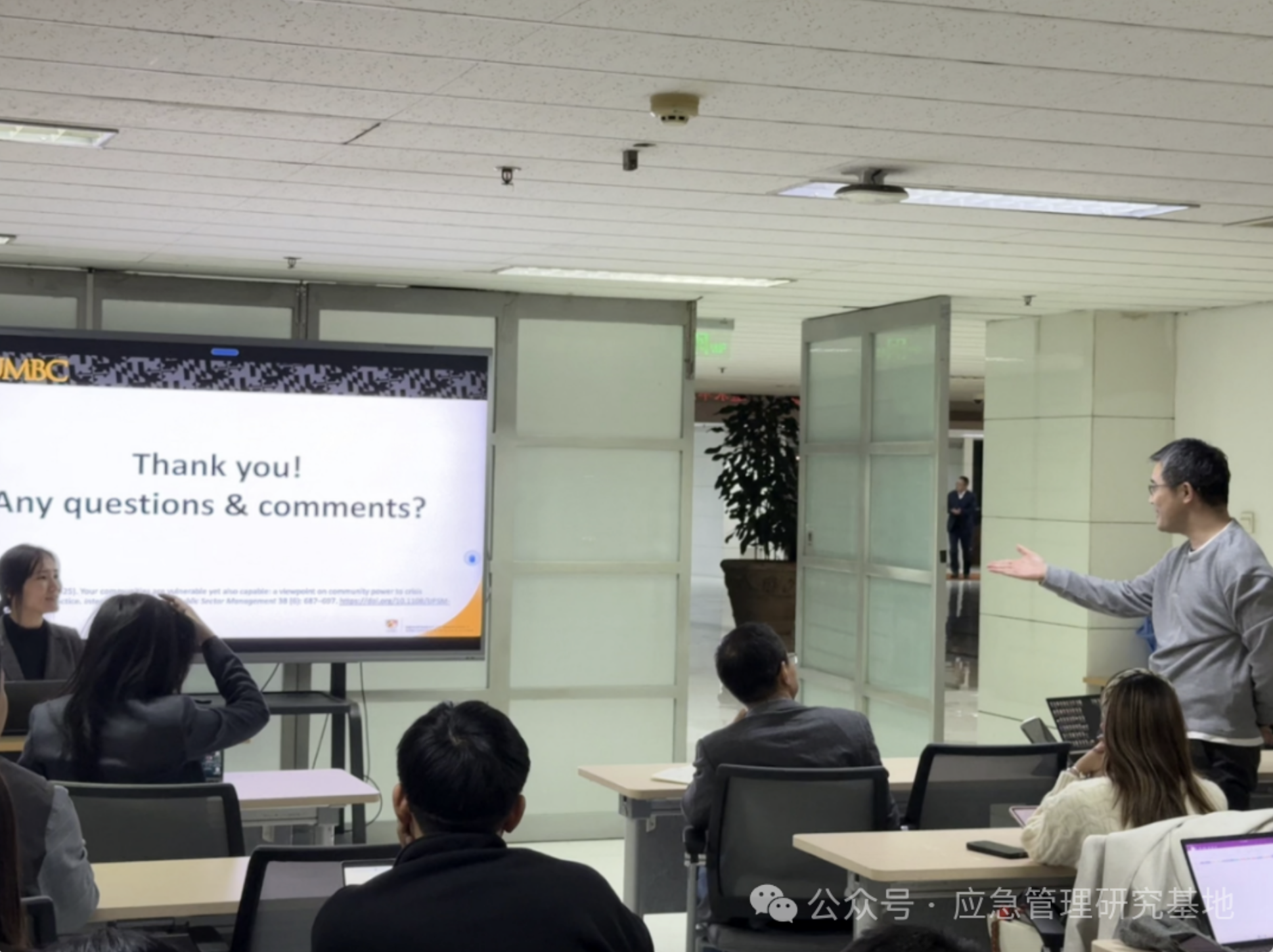 评议人吕孝礼副教授认为 Jungwon Yeo 教授基于两国的观察比较提出了有意义的研究议题,与中国场景中的一些现象也存在相通之处,并指出未来研究可进一步强化针对灾害幸存者的田野民族志工作;同时,他也分享了中国针对受灾害影响的特殊群体保护的立法和实务进展。 讲座最后,杨立华教授代表北京大学政府管理学院向Jungwon Yeo 副教授赠送一份伴手礼。本次讲座作为北大与清华应急管理专业联合举办的学术交流活动,希望未来开展更多深入的学术探讨,也期待师生交流能够为推动灾害韧性研究本土化与国际化融合发展注入新的活力。 来源|北京大学政府管理学院