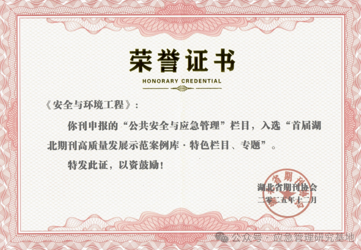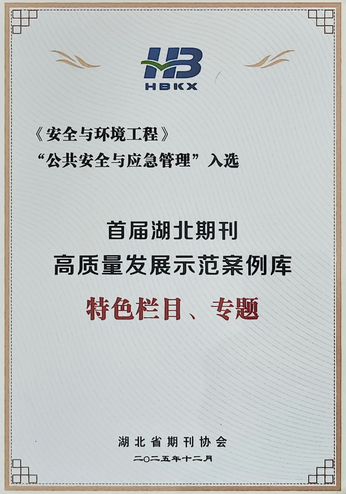 2026年1月22日,湖北省期刊协会2025年年会暨第六届二次会员大会在武汉召开。会上公布了首届湖北期刊高质量发展示范案例库入库项目,并为入库期刊和个人颁发了证书。经专家严格评审,《安全与环境工程》期刊长期倾力打造的 “公共安全与应急管理”栏目,凭借其清晰的定位、鲜明的特色与显著的学术影响力,成功入选 “特色栏目、专题”示范案例。