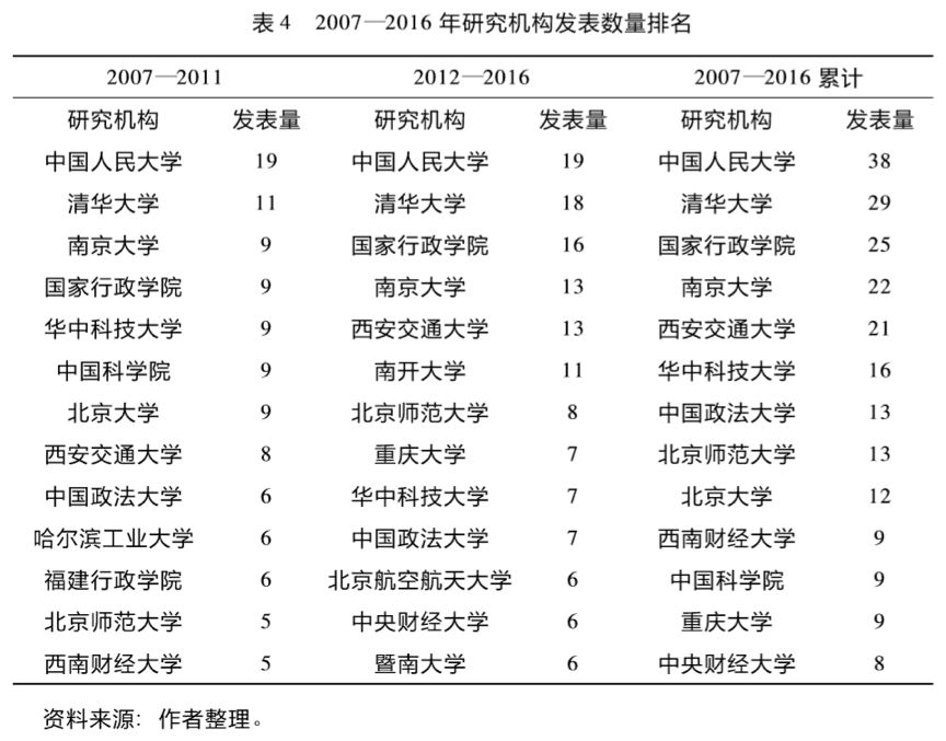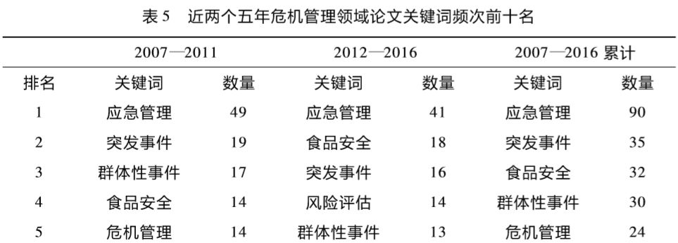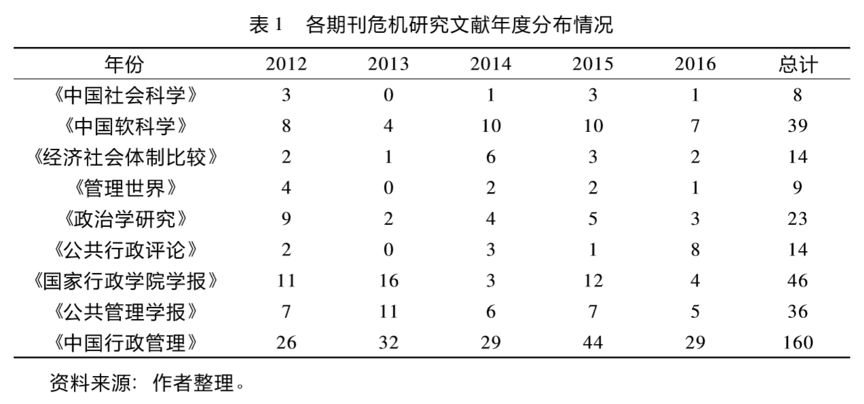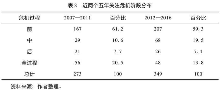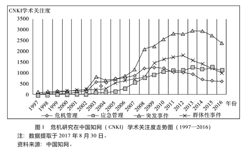 编者按:清华大学应急管理研究基地副主任吕孝礼副教授,基地硕士生朱宪,博士生徐浩联合撰写的论文《公共管理视角下的中国危机管理研究(2012-2016):进展与反思》近期刊发于《公共行政评论》2019年第1期,评析了2012至2016年的国内危机管理研究进展,这是继《公共管理视角下的中国危机管理研究——现状、趋势和未来方向》一文对2003-2012年国内危机研究评述的续篇。 论文摘要 公共管理视角下的中国危机管理研究(2012-2016):进展与反思 吕孝礼 朱宪 徐浩 【摘要】本文梳理了近五年(2012-2016)公共管理视角下的中国危机管理研究文献,并与前一个五年(2007-2011)进行对比分析,旨在描述领域研究现状和发展趋势,并指出未来发展方向。在筛选出349篇中文期刊文献后,采用定性和定量方法相结合开展分析。分析结果表明:在危机阶段方面,相比于前一个五年,近五年对危机前和危机全过程的研究均有所减少,但前者仍占最大比重,对危机后的研究依然最少;在危机前研究中,应急管理机制和体系最受关注;在研究类型方面,应然类研究占比有所下降,但仍然最高,理论检验类文章显著增多;研究事件类型方面变化不大,仍以一般危机事件和社会安全事件为主,公共卫生事件次之,自然灾害、事故灾难类研究较少。整体来看,近年来危机管理研究呈现出学术共同体更加健全、主题更加细化、研究方法更加规范化的特点,然而对危机和危机管理现象意涵和规律的探讨有待进一步深化。 【关键词】危机管理;应急管理;文献综述;公共管理 资助:国家自然科学基金(71774098,71790611);教育部人文社科青年项目(17YJC630101) 论文要点 近五年,中文学术产出在经历了前十年领域发展的爆发期之后正逐渐进入沉淀期(图1)。 评述文献来源及分布如下: 学术共同体演进:领域内“沉淀”出忠实的研究者并形成合作网络 中国危机研究 “无形学院”在近五年逐步发展完善,领域逐步由形成期向成熟期转变。2011年,国务院应急管理专家组组长闪淳昌、时任清华大学公共管理学院院长薛澜等共同发起成立“中国应急管理五十人论坛”,并于2014年开始增设“青年论坛”;2012年清华大学公共安全研究院发起成立了公共安全科学技术学会; 2014年中国应急管理学会正式成立。此外,由南京大学社会风险与公共危机管理研究中心主办的《风险灾害危机研究》成为国内危机管理领域第一本收录至中文社会科学引文索引 (CSSCI) 的专业集刊。 近十年,该领域无形学院的成员逐渐稳定。朱正威、钟开斌、张海波、童星、刘鹏等学者发表量较为稳定,近十年发表总量排在前五位。近十年高产作者排名如表3所示。前后两个五年,国内不少研究机构保持比较稳定的研究产出,并形成了相对稳固的机构间合作网络 (如表4所示)。 研究主题: 近十年研究主题变化较小,对特定的理论及概念关注不足 两个五年(2007—2011年及2012—2016年)文献样本中高频关键词排序及频数分布见表 5。 “应急管理”“突发事件”“危机管理”“公共危机”是前后五年均高频出现的关键词,而以此为关键词的研究多为对应急管理体系建设的思考,如国家安全战略; 国外经验的借鉴及国内经验总结; 对某项应急管理机制的探讨,如事故调查机制等。 以“群体性事件” “社会稳定风险评估” “社会稳定” “风险评估” “社会治理”为关键词的研究主要关注社会风险和危机。在“社会稳定风险评估”方面,以朱正威为代表的学者对社会稳定风险评估这一制度的兴起和发展作了大量的论述,包括第三方机构参与稳评、稳评工作的主体界定等议题(刘泽照、朱正威,2015)。 多数“风险评估”研究也与社会稳定风险评估有关,针对自然灾害、事故灾难的风险评估研究较少。对 “群体性事件”的探讨近年来仍然是学者关注的重点,与前五年相比也逐步走向深入,重点关注助推群体性事件演化过程的诱因等因素。以“社会治理”为关键词的研究多关注信访和社会冲突化解等议题。 关注“食品安全”的文献仍然保持较高水平,相关研究议题十分广泛,包括食品安全总体框架、财政投入、监管措施等。 研究结果显示,知识图谱中并未浮现出具有重要影响的理论或概念节点,频率较高的仍为与应急管理有关的一般性关键词。两个五年间虽有细微的差异,但总体来看并不明显。这反映出在目前的 “无形学院”内,尽管有较为稳定的成员与研究机构,然而研究多从具体的现象入手,对特定的理论及概念关注不足,“无形学院”尚缺乏有共识的理论范式。 研究类型:应然类研究减少,理论检验类研究增多,研究规范性上升,对危机规律的探索仍需加强 应然类研究从前五年占比58.2%到近五年占53.3%,其中不乏对当下应急管理的真知灼见和深度思考,然而大部分此类文章缺少数据支撑和严密的论证,容易沦为泛泛而谈。 理论检验类文章呈明显的增长趋势,从5.9%增至11.2%。 理论建构类文章从占比18.7%降至13.8%,目前仅有极少数学者对此做出了初步探索。 本文对理论检验类和理论建构中的实证研究进行进一步梳理,分别梳理了此类实证文章的研究主题、研究方法、研究贡献等要素。近五年在如下研究议题探讨比较集中,主要包括农产品风险、居民食品安全风险感知、灾害中的社会网络、网络舆情演化、危机中的合作网络、事故调查问责、政府信任。对这些议题研究进展的剖析将分别融入